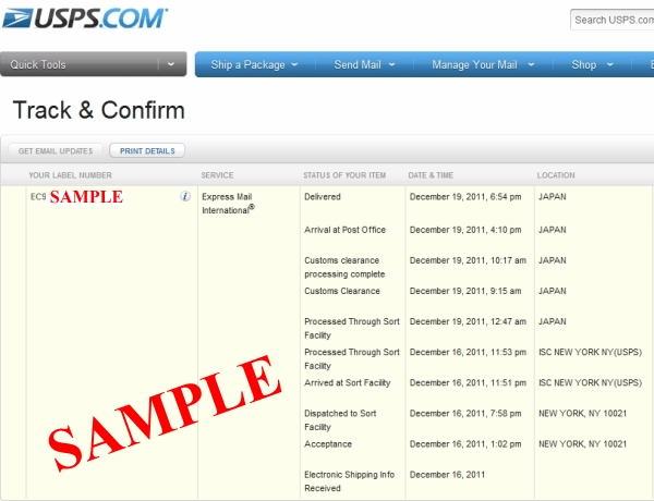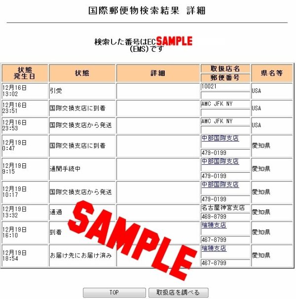 EMS追跡番号について: 米国の宅急便サービスを利用した場合発送後当社から発送状況を確認出来る追跡番号をお客様へにお知らせします。配達は週末・祝日を除き通常4-6日掛かります。発送後 https://tools.usps.com/go/TrackConfirmAction で追跡番号を入力すれば発送状況が分かります。又、荷物が日本に到着したらこの日本語のリンクでも配達状況を確認出来ます。http://www.post.japanpost.jp/int/ems/delivery/index.html 商品の発送の引受から始まり、米国際交換支店に到着、米国際交換支店から発送、日本国際交換支店に到着、通関手続中、日本国際交換支店から発送、通過からお届けまで発送状況を確認出来ますのでお客様もご安心です。更に各時点の「取扱店名」と電話番号など詳細も確認出来ますので安心出来ます。